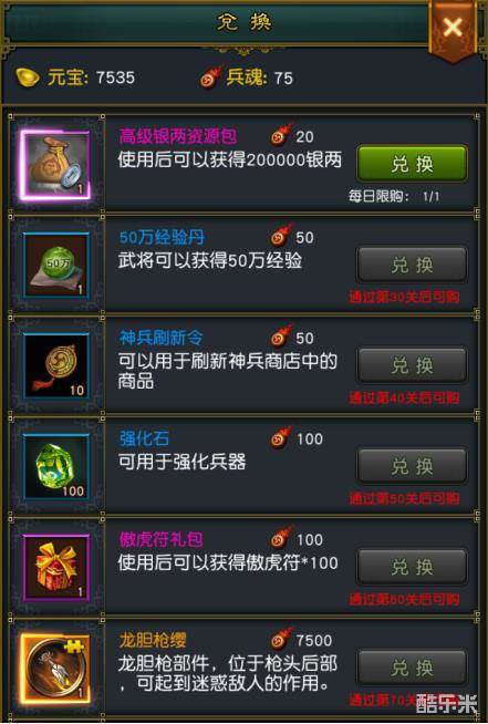每种可兑换的道具都有通关数的要求,只有通过相应的关隘才能开启该道具的兑换。
