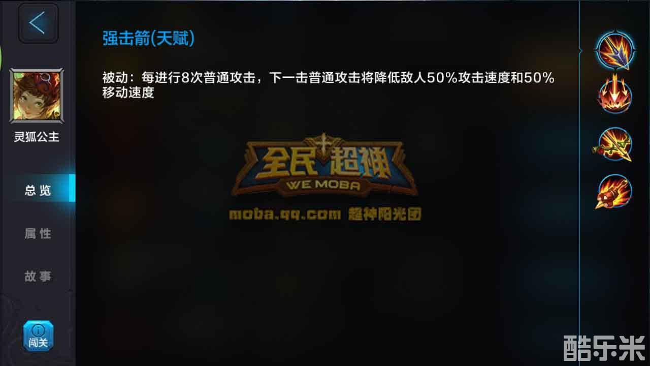 强击箭(天赋):被动 每进行8次普通攻击,下一击普通攻击将降低敌人50%攻击速度和50%移动速度。