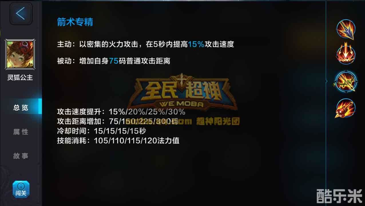箭术专精:主动 以密集的火力攻击,在5秒内提高15%(满级30%)攻击速度。