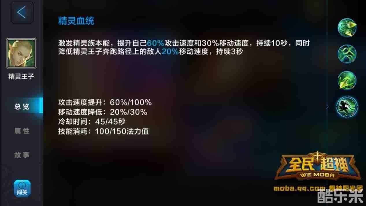 精灵血统:精灵王子激发精灵族本能,提升自己的攻击速度,并且提升移动速度,同时降低精灵王子奔跑路径上敌人的移动速度。