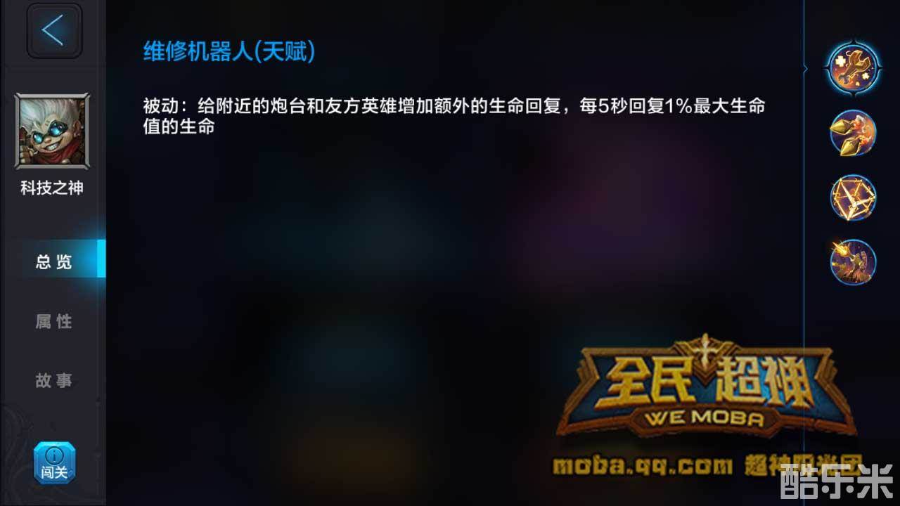 技能介绍:被动技能,给附近的炮台和友方英雄增加额外生命回复,每5秒回复1%最大值生命。