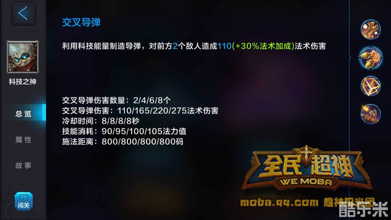 技能简介:利用科技能量制造导弹, 对前方2个敌人造成110(+30%法术加成)法术伤害。
