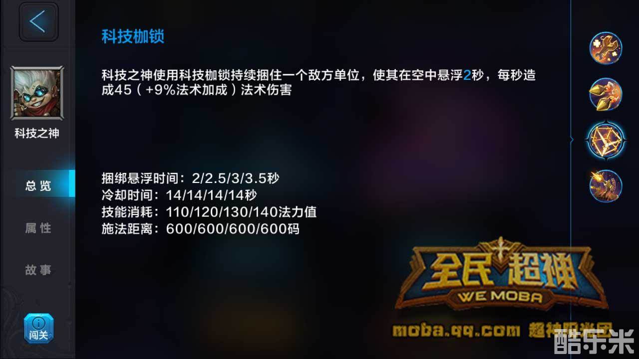 技能介绍:科技之神使用科技枷锁捆住一个地方单位,使其在空中悬浮2秒,每秒造成60法术伤害。