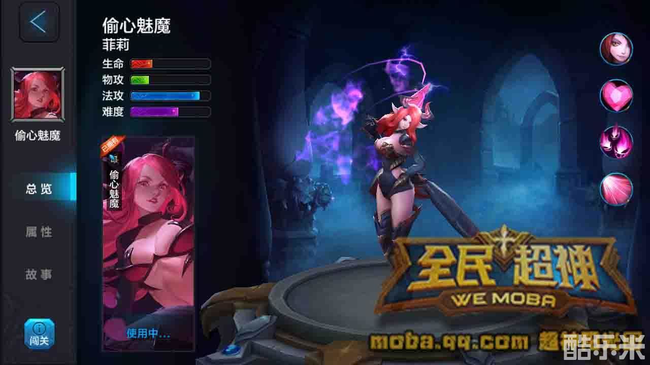 偷心魅魔菲莉全民超神中的魅力女神,有着超高的输出,团战中的APC,强悍的技能,只要被其魅惑到,很可能就会一命呜呼哦!