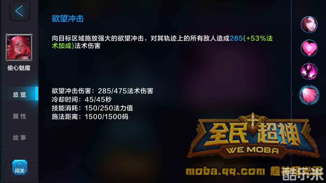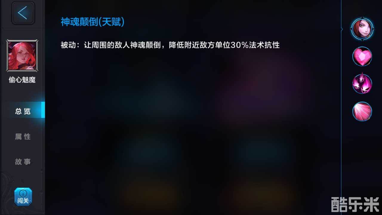 技能介绍:偷心魅魔让她周围的敌人神魂颠倒,降低附近敌方单位的魔法抗性。