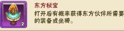 简介:打开后有概率获得东方伙伴所需要的装备或者坐骑