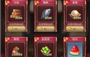首先是基本的元宝商城,这里需要使用元宝进行购物欲,里面有基本的木材和精铁两大基本物资,还有食物、铜钱等其它的资源,最为使用。