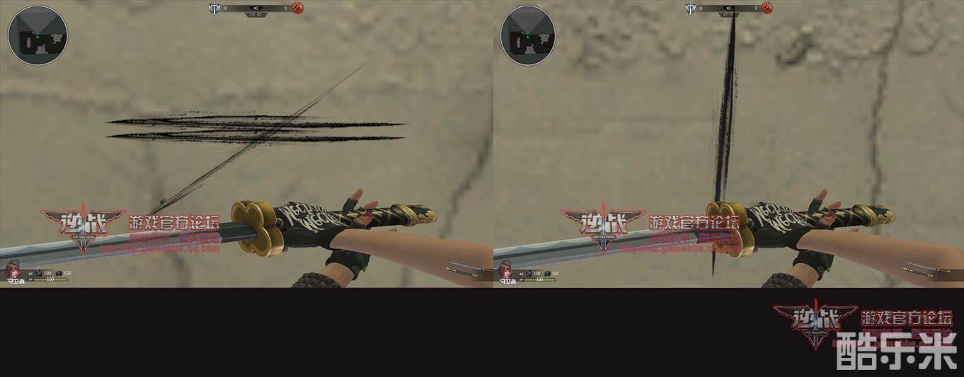 上图为鬼武长刀的攻击方式,左图为轻刀攻击痕迹,右图为重刀攻击痕迹,轻刀攻击为交叉攻击,重刀攻击为竖砍,虽然在无AC的情况下,鬼武长刀轻刀不爆头依旧可以一刀杀敌,但小编还是感觉使用重刀杀人的感觉更好哟。