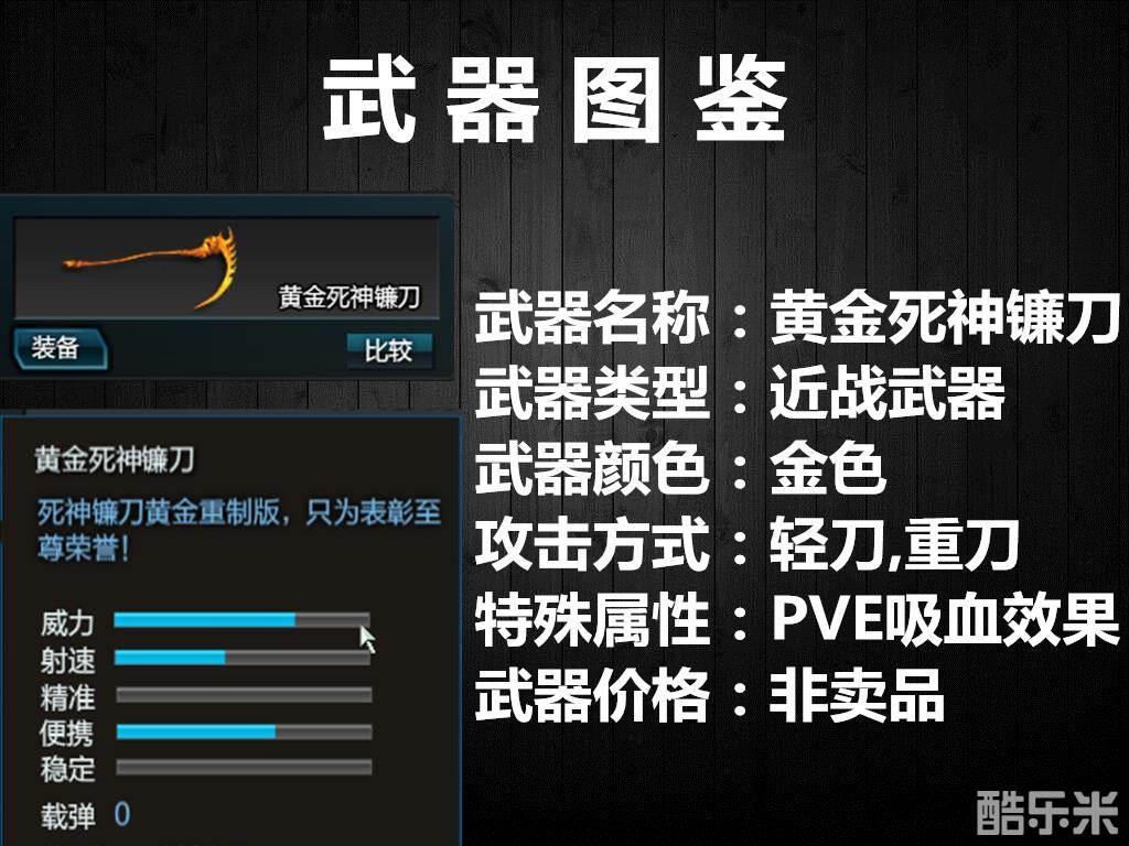 死神镰刀是枪战网游逆战推出的一把永久近身武器,是大boss幽魂骑士——诺曼第公爵手中主宰死亡的镰刀,曾伴随公爵征战欧洲。击杀幽魂骑士后有几率拾取,僵尸猎场模式杀敌可吸收敌方血量从而恢复自身生命值。 黄金是死神镰刀升级版。