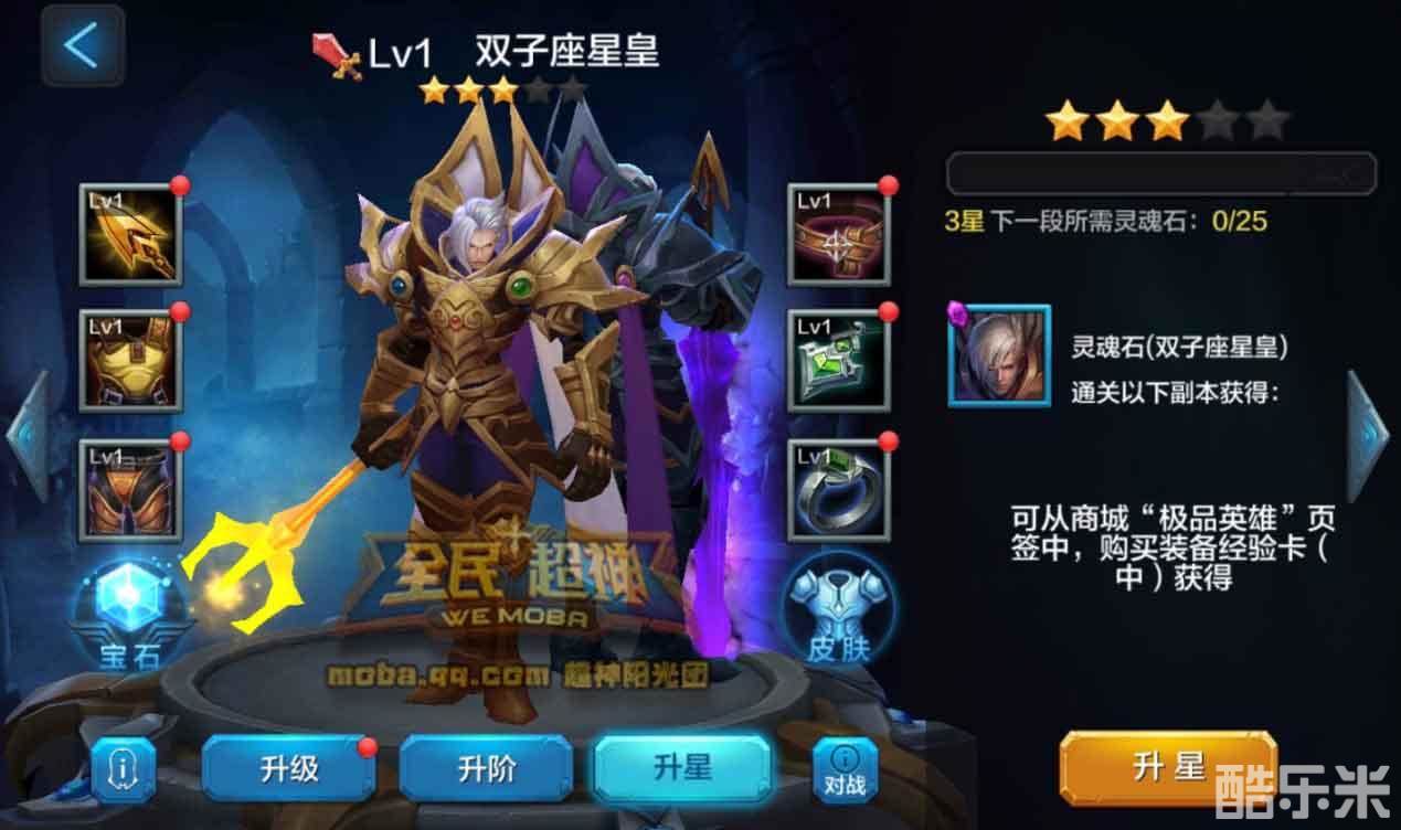 最后一个就是英雄的星等,双子座初始为3星,需要通过灵魂石不断升星。每个星等之间升级需要5次, 3星升4星每次需要25个灵魂石,总计需要125个灵魂石;4星升5星每次则是需要50个灵魂石,总计需要250个灵魂石。双子座灵魂石获取暂时只能通过商城限时上架购买,或者钻石抽奖获得,所以对于平民玩家,还是不要过于追求星等,一切量力而行吧。