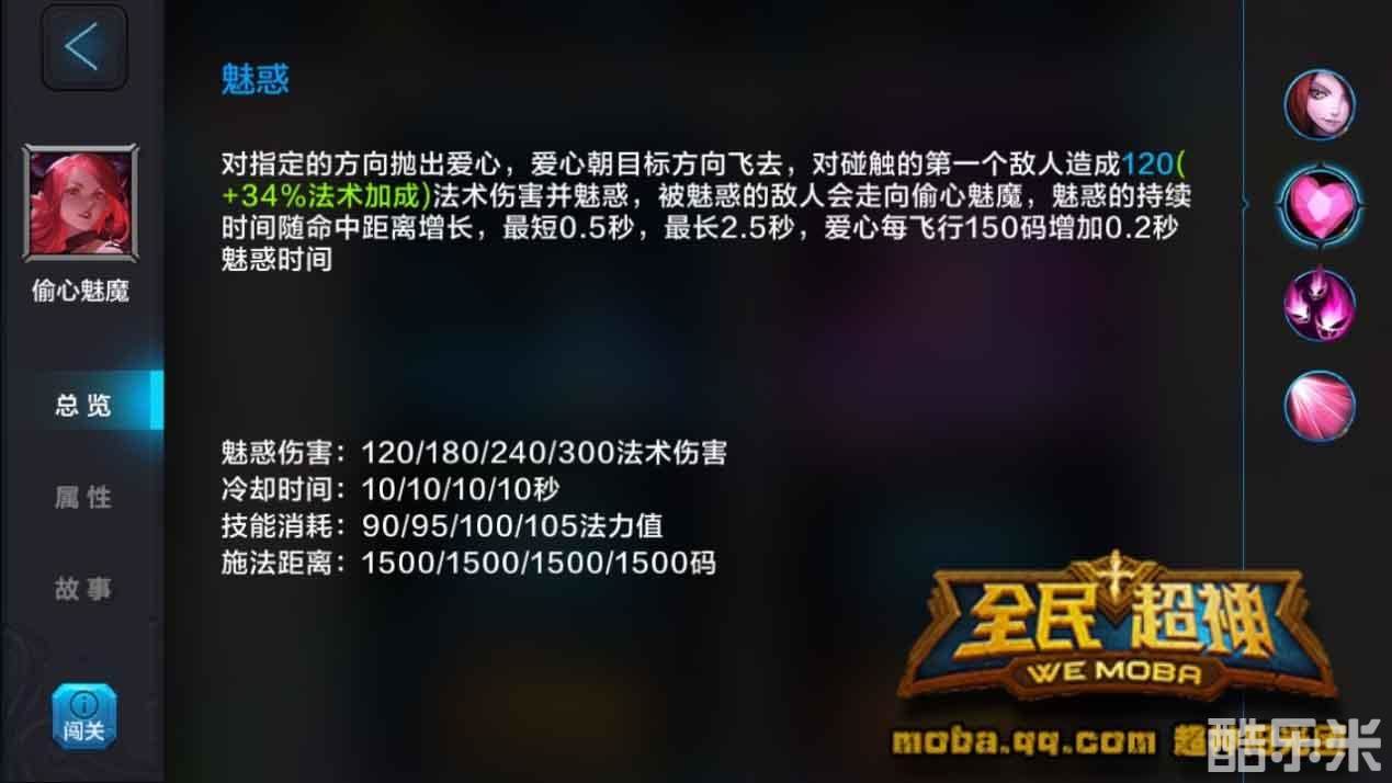 魅惑:对一个敌人的方向抛出爱心,爱心朝目标方向飞去并魅惑碰触的第一个敌人,对其造成法术伤害并使其走向魅魔并减速。