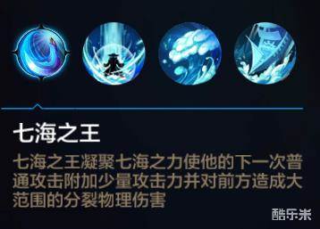 七海之王(天赋):被动 七海之王凝聚七海之力使他的下一次普通攻击附加少量攻击力并对前方造成大范围的分裂物理伤害