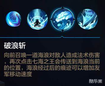 破浪斩:向前召唤一道海浪对敌人造成法术伤害,再次点击七海之王会传送到海浪当前的位置,海浪经过后的痕迹可以增加友军移动速度。