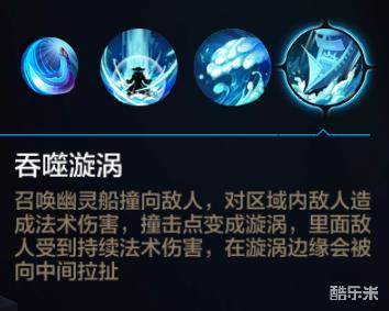 吞噬漩涡:召唤幽灵船撞向敌人,对区域内敌人造成法术伤害,撞击点变成漩涡,里面敌人受到持续法术伤害,在漩涡边缘会被向中间拉扯。