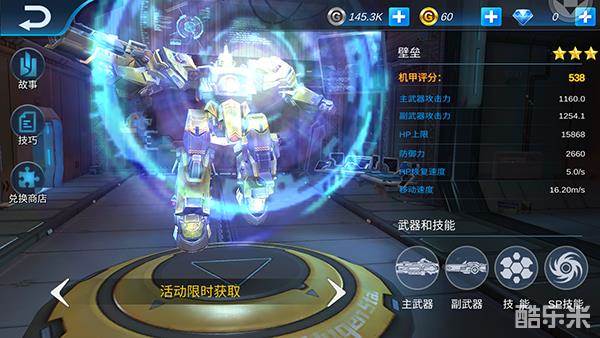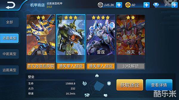 在主界面打开机库,点击选择近距离型-壁垒,可查看该机甲的详细信息。