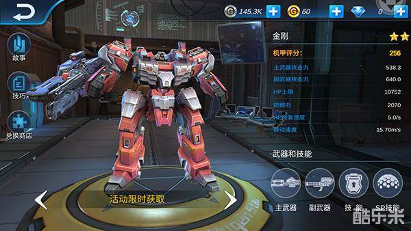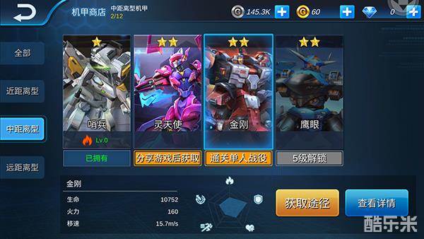 打开机甲库,点击选择中距离型-金刚,可查看该机甲的详细信息。