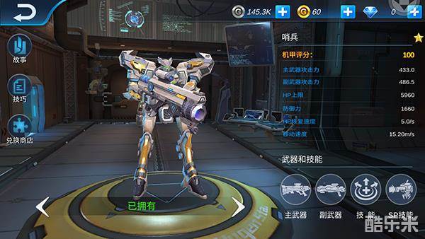 打开机甲库,点击选择中距离型-哨兵,查看该机甲的详细信息。