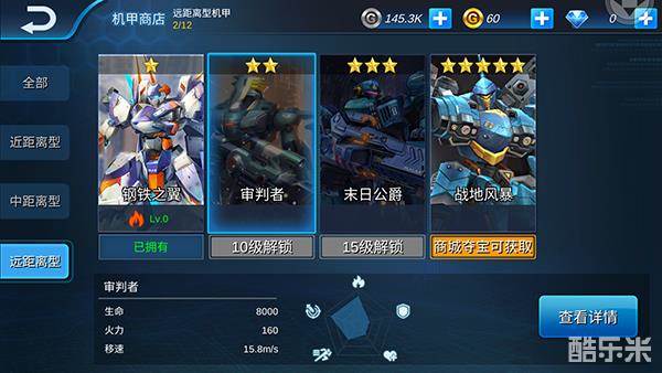 打开机甲库,点击选择远距离型-审判者,可查看该机甲的详细信息。