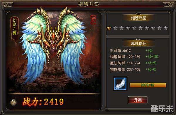 “战斗力”越高,则整体实力越强。战斗力共由9项主要构成,对战斗力的影响从高到低依次如下:强化、洗炼(效果很直接)、套装效果(整套属性伤害爆炸)、神翼(翅膀相对比较良心刷怪可以掉材料)、装备(跟据自己能力搞)、高级技能(只能靠刷BOSS获得)、勋章(非常长线的功能,属性收益蛮高,花点钱可以升的快些。),“人物”随着等级走,无法自己调整。下面来介绍下翅膀属性: