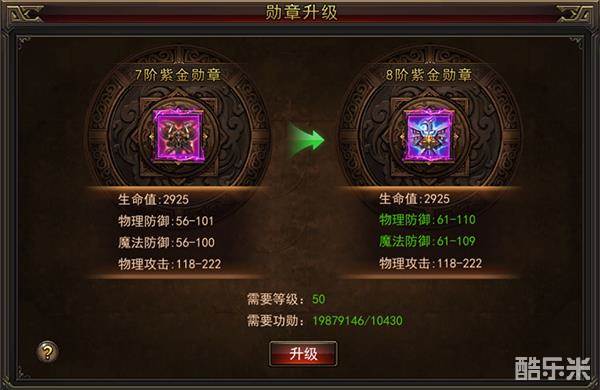 “战斗力”越高,则整体实力越强。战斗力共由9项主要构成,对战斗力的影响从高到低依次如下:强化、洗炼(效果很直接)、套装效果(整套属性伤害爆炸)、神翼(翅膀相对比较良心刷怪可以掉材料)、装备(跟据自己能力搞)、高级技能(只能靠刷BOSS获得)、勋章(非常长线的功能,属性收益蛮高,花点钱可以升的快些。),“人物”随着等级走,无法自己调整。下面来介绍下勋章属性: