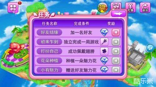 任务:任务系统,记得要经常查看哦,完成任务可以获得游戏中各种装扮稀有的道具哦