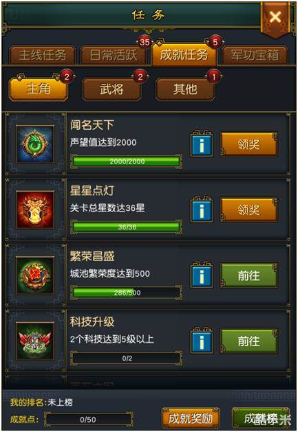 任务系统是《权御三国》的基础系统之一,通过任务按钮可以进入任务界面。游戏中所有的任务都可以在这里查看到,共分为主线任务、日常活跃任务和成就任务三个切页。