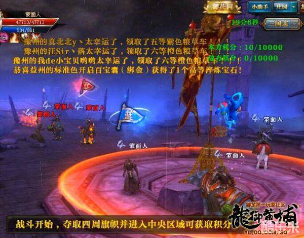刚进入战场时,有30秒的倒计时,当界面提示战斗开始时就可以向前冲杀了。所有参战玩家分为红蓝阵营,双方都显示为蒙面人,通过采集旗帜来累计积分,首先达到10000积分的一方获得本场战斗的胜利,若时间结束,积分高的一方获得胜利,胜利的一方将会有额外的武勋奖励。