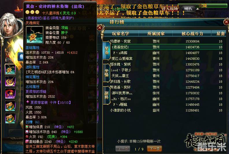 现在的l逍遥世纪l虽然本人比较忙,但还是没有放下《御龙在天》,仍然积极投入其中,充值也不予余力,只要有需要肯定会第一时间投入金钱,提升自己的属性。而这次的项链黄金精源与副手黄金精源刚刚出来,他的账号就第一时间参与到活动中,成功开出了最后两个部位的黄金精源,使得他成为第一位完成全套黄金装备的玩家,也为他的《御龙在天》之路再添辉煌。