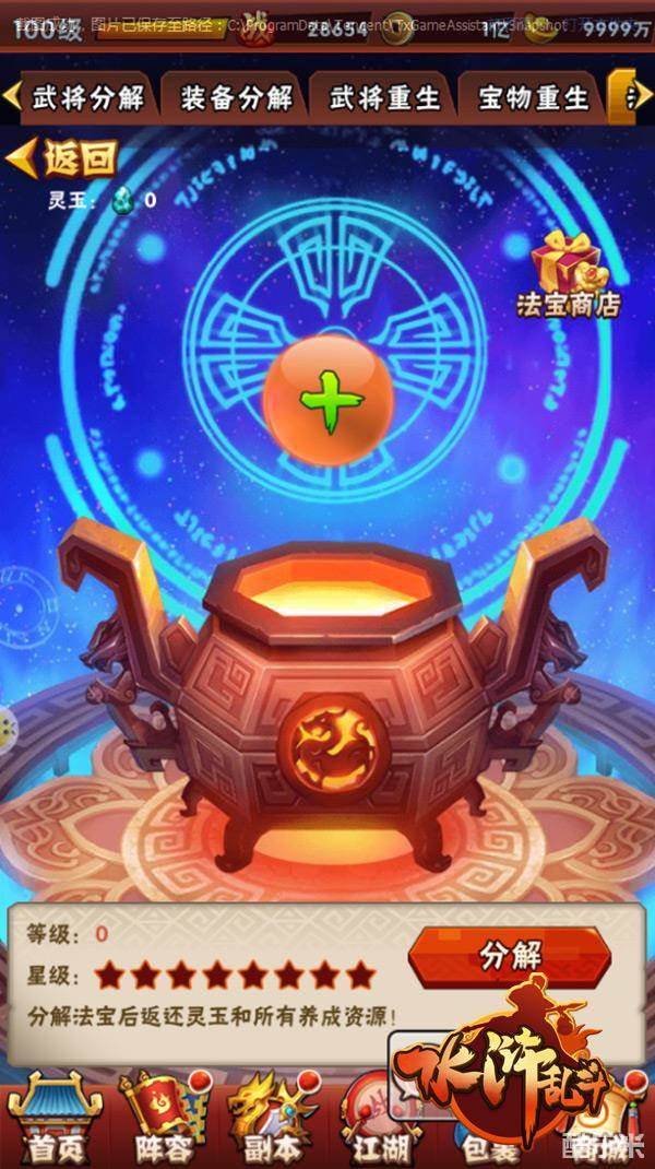 在这个“大熔炉”中,可以分别进行以下分解:“武将分解”、“装备分解”、“武将重生”、“宝物重生”、“法宝分解”、“法宝重生”。