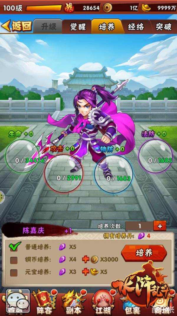点击武将本体,再点击培养,就可以对四大基础属性“生命”、“攻击”、“物防”、“法防”进行加成。培养需消耗培养丹,也可以按次数批量进行培养操作。