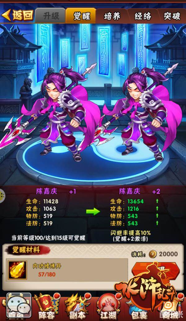 如果有你两个相同的武将,就可以使用“内功修炼丹”对其进行觉醒!觉醒后的武将将在其名字后面追加+2/+3……等后缀标记,代表了当前的觉醒程度。觉醒程度越高,武将的基本属性以及隐藏技能都将被深度激活!
