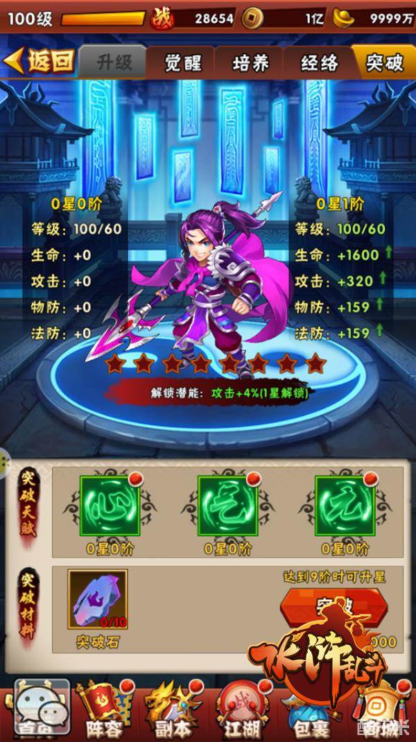 使用护心精华及神秘精华对“心”、“气”、“元”三大系统进行升阶,来达到突破天赋的目的。当武将升至9阶时,便可使用突破石进一步进行升星。升阶升星可以对武将的基础属性提升相当大的水平台阶,同时更可以解锁其潜能。你的武将与他人能拉开多大的战力距离,除了基础属性以外,潜能技能也是非常重要的!往往多一个技能就可以左右战场战局哦!