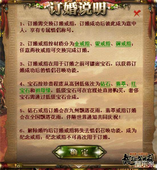 征战沙场,怎能没有佳人陪伴。相信很多御龙小伙伴都在御龙在天中找到了与子偕老的另一半,如何大大方方的秀恩爱,如何向所有人证明你们的爱,订婚和结婚系统是你们必须了解的游戏功能。