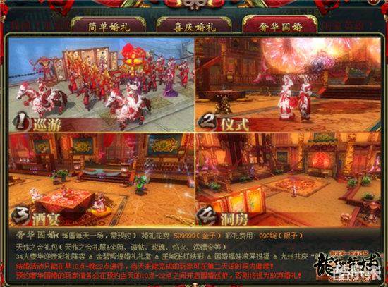 选择结婚后,玩家需要选择婚礼的简易程度,御龙在天的婚礼分为简单、喜庆和奢华国婚三种规格,不同规格婚礼对应不同的迎亲彩礼排场、婚礼礼包、礼服,以及婚礼礼堂。