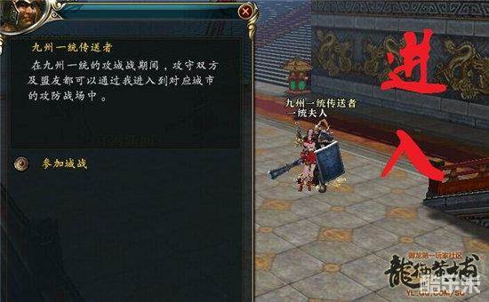 周日晚上20点城池被宣战的国家和宣战国家满足等级条件的玩家可以在王城郡守附近,即王城坐标(580,700)位置点击九州一统传送者进入战场,并且盟国也可以在此位置点击参与战斗。开始战斗之后,玩家通过九州一统界面可以重复进入战场。