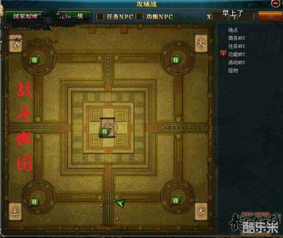 城池战地图和国战内城地图类似,但是分为金木水火土五面旗帜。左上为水,右上为火,左下为土,右下为木,中间为金。双方玩家需要占领旗帜之后,获得城池民心,所给民心值具体数值有待玩家发掘,流程与帮战相同,先获得10W民心值获胜,或者在城池战结束之前获得民心多的一方获胜,历时60分钟。