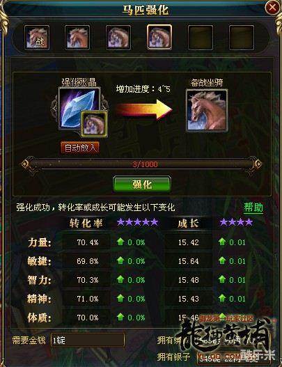 从以上这些机智的小伙伴们一定明白了,转化率和成长值的★越多,坐骑品质就越好这个简单的道理,如果你所得到的坐骑转化率和成长值并不理想,则可用强化水晶对马匹进行强化。