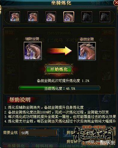 你可以使用一匹坐骑对备战坐骑进行炼化, 炼化一次提升一定额度的炼化度,只有当炼化度达到100%的时候,备战坐骑才算炼化成功,此时将提升该坐骑的某一个属性值(转化率或属性的数值)。用于炼化的辅助坐骑的等级、转化率、成长、携带等级越高,对备战坐骑的炼化度的提升越大。备战坐骑可重复被炼化,但每次炼化只提升某一个属性(转化率、成长、属性的数值),并有可能覆盖前一次炼化的效果。另外炼化会消耗一定绑银,每天前十次消耗较小,三次后,炼化所需绑银会大幅增多。