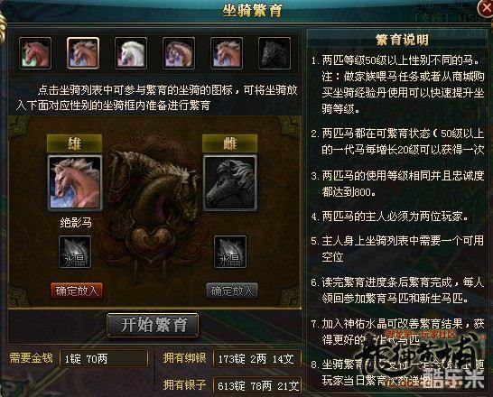 了解了这么多,那么坐骑从哪得来呢?首先,小伙伴们应明确,坐骑分为一代和二代,一代马最高品质为2-2,作为游戏人物的坐骑显然品质太低,而二代马的最高品质可以达到5-5,所以我们要用一代马来繁育二代马,坐骑达到50级以后可以进行第一次繁育,以后每升20级,可以繁育一次。所生小马的品质和血统都是随机的,繁育出的马品质什么样,只能看运气了。