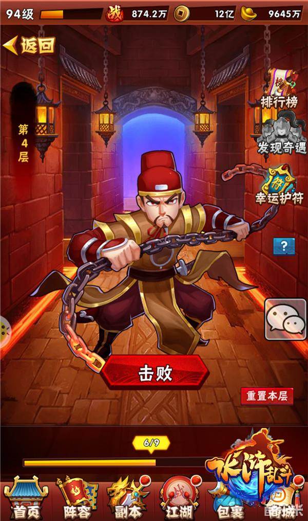 天牢探索则是一个结合了趣味问答和回合战斗的玩法。在迷宫中, 每次玩家可以从“前、左、右”三个方向中选择一个方向前进,前进后会触发一个事件,答题或是击败敌人可得宝箱。经过8次选择后会遇到本层的BOSS,击败后获得丰厚奖励,然后进入下一层。周而复始,不断前进。