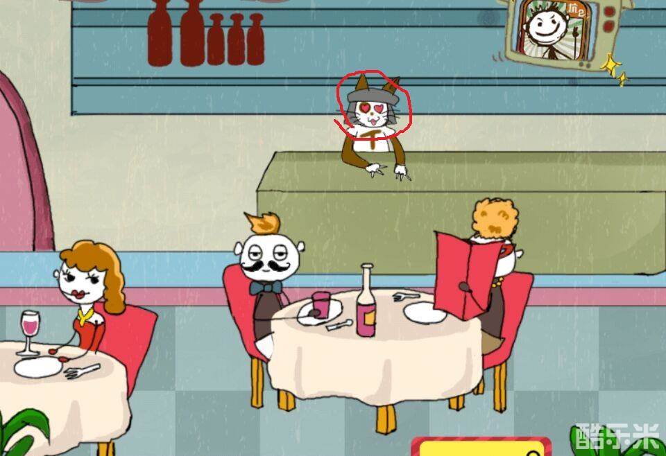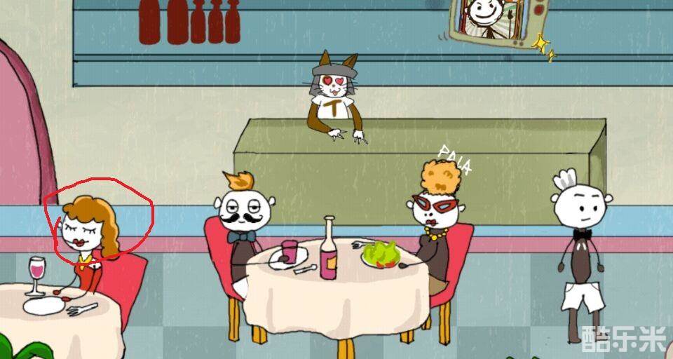 我们一开始要先点击猫咪的眼睛,过一会会来一个服务员,当服务员出现的时候我们点击美女的眼睛,然后美女和服务员双宿双飞一起离开了餐厅,玩家们就赢了~