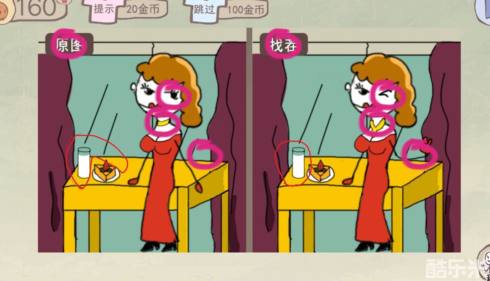 游戏中玩家们仔细观察可以明显的看出有四处不同就是上图红圈内的四个,但是还差一个在哪里?