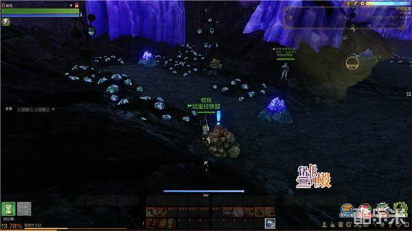 为了给大家更好的介绍,笔者选择了一个夜深人静的时间点,开了两个号(一个大号一个小号),到2点钟方向的矿洞,开始挖岩石壁障。运气不错,整个过程中没有遭受到敌对的骚扰。岩石壁障一共分三层,第一层是坚硬的岩石壁面,大概要挖250下。