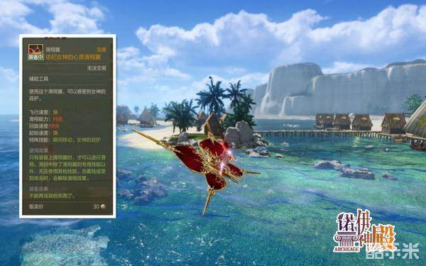 这款滑翔翼叫:阿斯特拉之翼。据说是在原大陆上万神殿中的高阶祭司阿斯特拉,可是代表“意志”的神明,它双翼上的羽毛具有神奇的力量,如果将这根羽毛拿在手中祈祷,就能长出和他一样的翅膀。听上去好像很厉害的赶脚。不过这款滑翔翼的外形却也是我很喜欢的一款,它不像别的滑翔翼是驾驭在上面的,而是像翅膀一样,飞行时候一跃而起,非常的优雅,我觉得妹子们肯定都和我一样喜欢\(^o^)/~。飞在空中的时候就好像天使降临,纯洁又美丽。至于它的属性来说除了自由飞行不是特快以外,其他的技能都是特快的。并且它的特殊技能都带了左右瞬移,解决了很多高难度的攀爬。也是一款商城活动箱子开出的稀有翅膀哦,不过目前活动结束,所以箱子也就随之下架。因此想要再次拥有的宝贝,就只能等等等了。