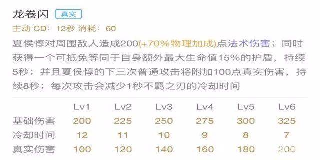 数值分析:基础伤害随着等级提升而增加,后期达到了325,冷却时间达到了7秒,真实伤害达到了200,二技能不仅能给夏侯惇提供护盾,还有附带真实伤害,让夏侯惇在站撸方面有很强的能力,所以建议主点二技能副点一技能。