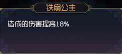被动铁扇公主,造成的伤害提升18%。这个是比较夸张的被动直接加伤。