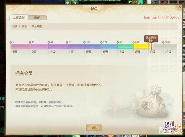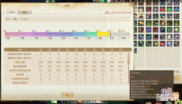 如果你是上古会员,在游戏中点开右下角的会员。点开福利,可以看到不同会员等级线上单位时间可以恢复的劳动力点数。如图所示,笔者是9级会员,在线每5分钟恢复14点劳动力。PS;会员的等级提升是每日登陆积累几分的。每天到登陆有3积分,积分规则同样是点开游戏右下角的会员,然后点开积分规则可以看到。如图所示,笔者是864积分,也就是登陆了288天了。