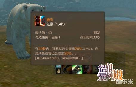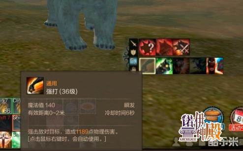 宠物雪花熊共可拥有5个技能,第一个技能是“强打”:挥动爪子攻击2米内的一个敌人,造成物理伤害。消耗魔法值140,冷却时间6秒,这个技能是宠物雪花熊的基础技能。由于该冷却时间很短,在开启自动使用(右击技能图标)后,很快就会把熊宝宝的魔法值用光,所以在长时间战斗的时候最好不要自动使用此技能。