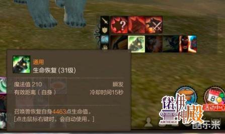 雪花熊从第二个技能开始就会出现差异了。第二个技能是回复技能,有可能是“生命恢复”(瞬间恢复生命值,冷却时间15秒),也有可能是“舔舐伤口”(在10秒内慢慢恢复生命值,冷却时间15秒)。这两个恢复技能的回复总量是一样的,区别就在于一个是瞬间恢复,一个是缓慢恢复。他们各有好处,生命恢复由于是瞬间恢复好几千的血量,在危急时刻很容易瞬间回复生命达到安全血量。而极效治疗的存在,使得缓慢恢复的总量在实际情况下往往会超过技能显示的数值。不过总体来说瞬间恢复要比缓慢恢复好,在人物攻击越来越高的现版本,已经很少有时间留给宠物慢慢回血了。