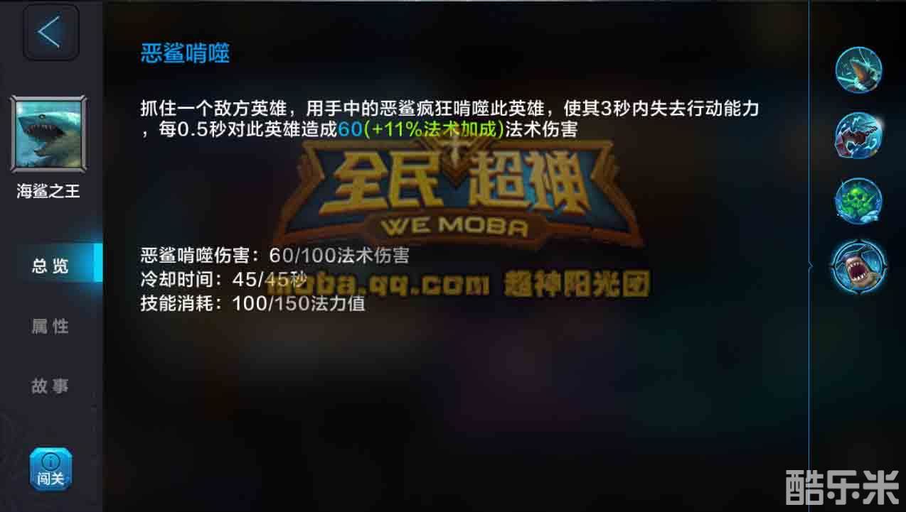 恶鲨啃噬:抓住一个地方英雄,用手中的恶鲨疯狂啃噬此英雄,使其一定时间内失去行动能力,并造成法术伤害。
